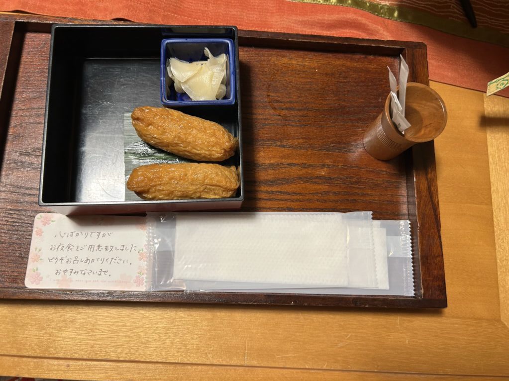 お部屋に戻ると夜食のいなり寿司が置いてありました!