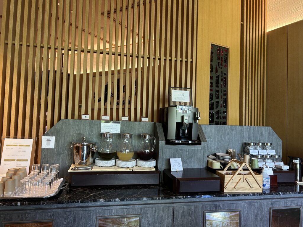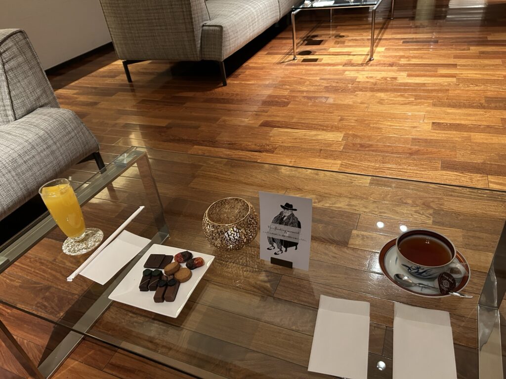 ここで、ドリンクを飲みながらホテル滞在中の過ごし方や夕食、朝食についての説明をしていただきました。