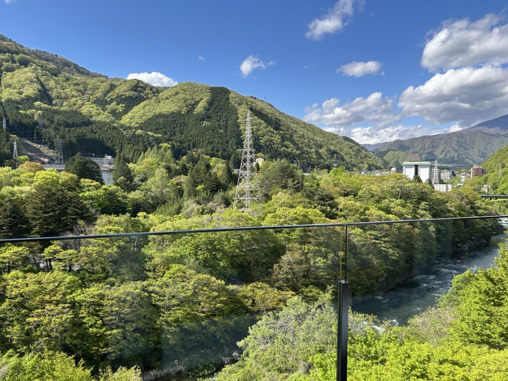テラスに出てみると、目の前に広がる大自然!!新緑の緑もとても綺麗ですし、紅葉の時期も行ってみたくなりました。↓